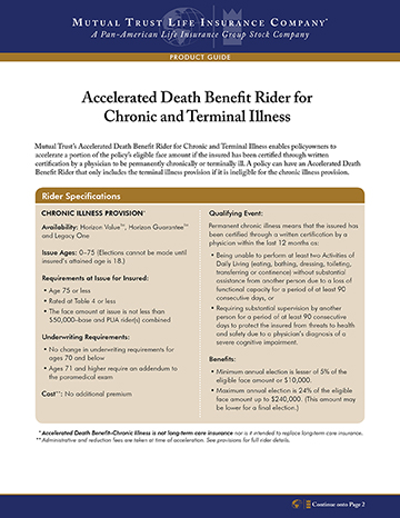 This rider allows the policyowner to accelerate the policy death benefit based on the insured's chronic or terminal illness condition as described below. The rider is available at no additional up front premium. (Fees are assessed at the time of acceleration.)